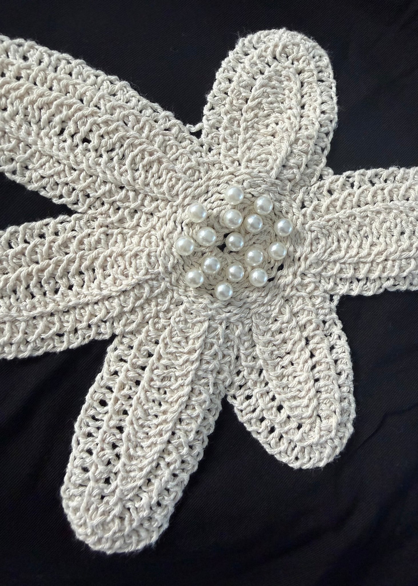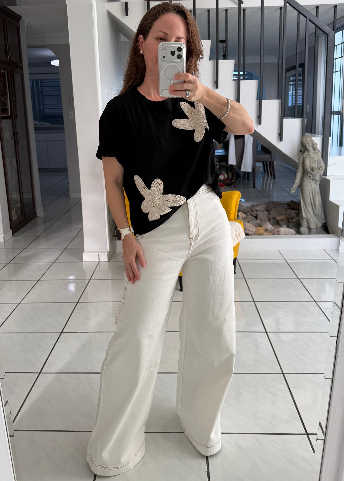 Add a touch of elegance to your everyday style with this chic black tee featuring delicate floral appliqué details. Designed with a relaxed silhouette and soft fabric, this versatile piece blends comfort and sophistication, making it perfect for casual or elevated looks.